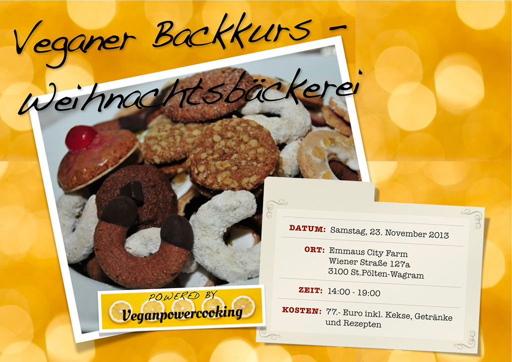 Passend zu Jahreszeit werden herrliche vegane Weihnachtskekse gebacken, soweit möglich alles BIO und mit frisch gemahlenem Dinkelmehl. Es entstehen insgesamt 10 verschiedene Kekssorten, quer durch die klassische Weihnachtsbackstube, inkl. Vanillekipferln, Lebkuchen & Co, aber auch neue Kekskreationen. Wer schon einmal Vanillekipferl aus Vollkorndinkelmehl und echter Bourbonvanille gegessen hat, wird alles andere nur mehr für einen müden Abklatsch halten! Nur vegane Weihnachten sind wirklich friedvolle Weihnachten! Wann: Samstag, 23. November und Sonntag, 24. November 2013 von 14:00 bis voraussichtlich 19:00 Uhr Kursgebühr: € 77.- Anmeldung unter: (Kontakt-Formular entfernt)(mailto:contact@veganpowercooking.at) Weitere Infos hier!