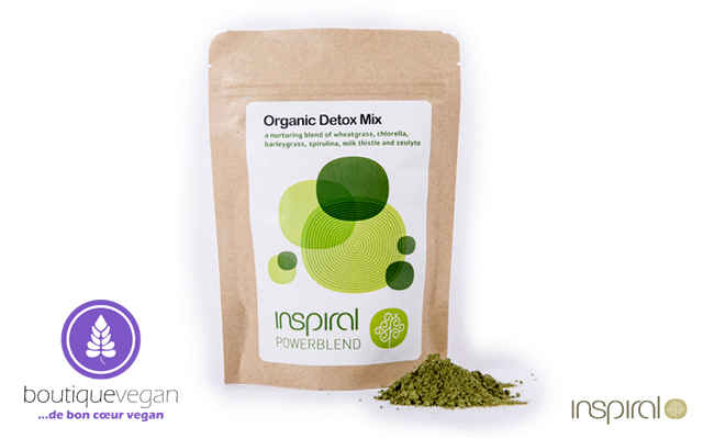 Dieser Pulver-Mix wirkt basisch, enthält wichtige Mineralien und ist reich an Chlorophyl und Magnesium. Die Inhaltsstoffe sind vielversprechend: Weizengraspulver (33%), Spirulinapulver(23%), Chlorellapulver(8%), Mariendistelsamenpulver (16%), Gerstengraspulver (16%) und Zeolithpulver (5%). Weiters sind die Zutaten biologisch, vegan, glutenfrei, gentechnikfrei, ohne Zucker und ohne Konservierungsstoffe. Die Zubereitung kann beliebig gestaltet werden: 1-3 Teelöffel am Tag in den Smoothie, in naturtrüben Apfelsaft, in ein Glas Wasser oder in einen Pflanzenmilch-Shake mixen sind einige Beispiele. Der Detox Mix kostet € 12,85 für 130 g in wiederverschließbarer Verpackung (gesehen bei boutiquevegan). Energie Mix und Vital Mix sind weitere Produkte aus dem Sortiment von Inspiral. Des weiteren gibt es Grünkohl-Chips in verschiedenen Varianten (wie zB Baobab & Zwiebel, Wasabi & Weizengras oder Rote Beete & Acerola), Powersnacks mit Beeren, Bananen und Schokolade sowie gefriergetrocknete Durian und Inka Beeren. Der Inspiral Detox Mix ist im Online-Shop boutiquevegan aus Deutschland erhältlich. Ebenso führt boutiquevegan 18 weitere Insprial-Produkte, liefert EU-weit, ist gut sortiert (150 Hersteller!) und dessen Produkt-Kennzeichnungen sind sinnvoll gewählt: biologisch abbaubar, glutenfrei, umweltbewusst, biologisch, sojafrei, nussfrei, fairtrade, Rohkost, Kühlware, ohne Zuckerzusatz usw. Des Weiteren ist es möglich für je € 10 Einkaufswert einen Treuepunkt zu sammeln, der wiederum € 0,25 wert ist. -CF