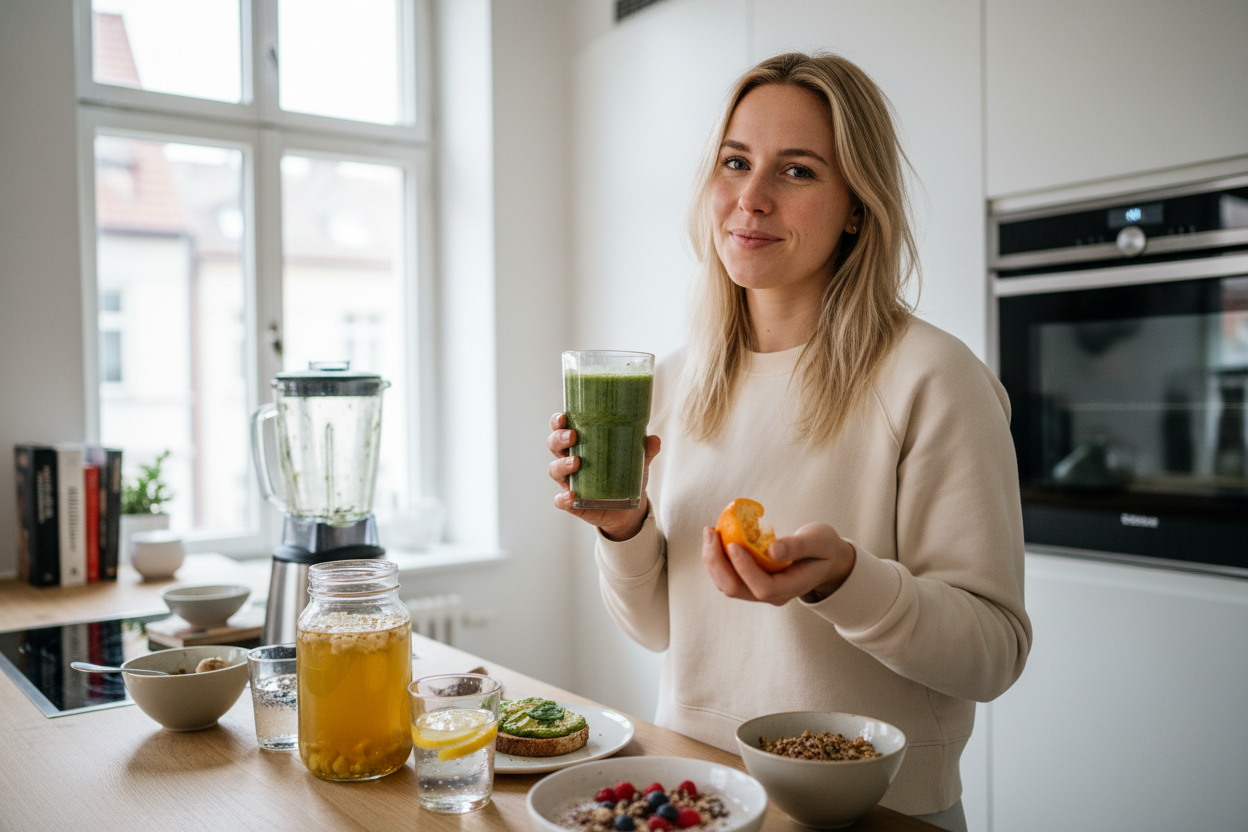 - Grüner Smoothie: Banane, Spinat, Ingwer, Zitrone und Kokoswasser – der ultimative Vitamin- und Elektrolyt-Booster