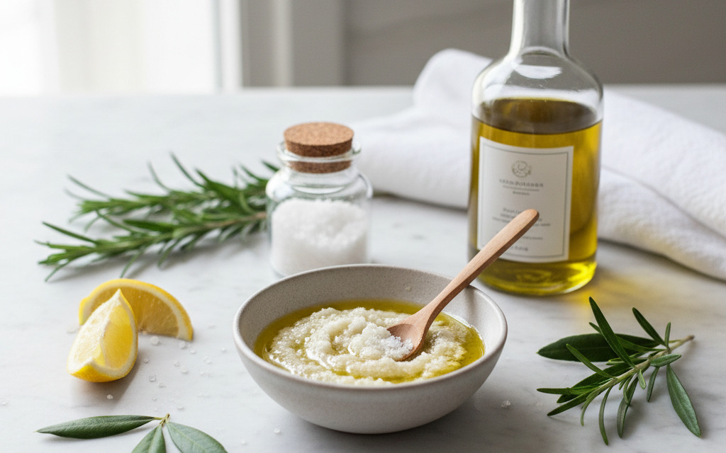 1 TL grobes Meersalz mit 1 EL Olivenöl vermischen. Die entstandene Paste auf den Händen verreiben und anschließend mit lauwarmem Wasser abspülen. Wem das zu grob ist: Das Salz kann auch durch 1 TL Zucker ersetzt werden.
