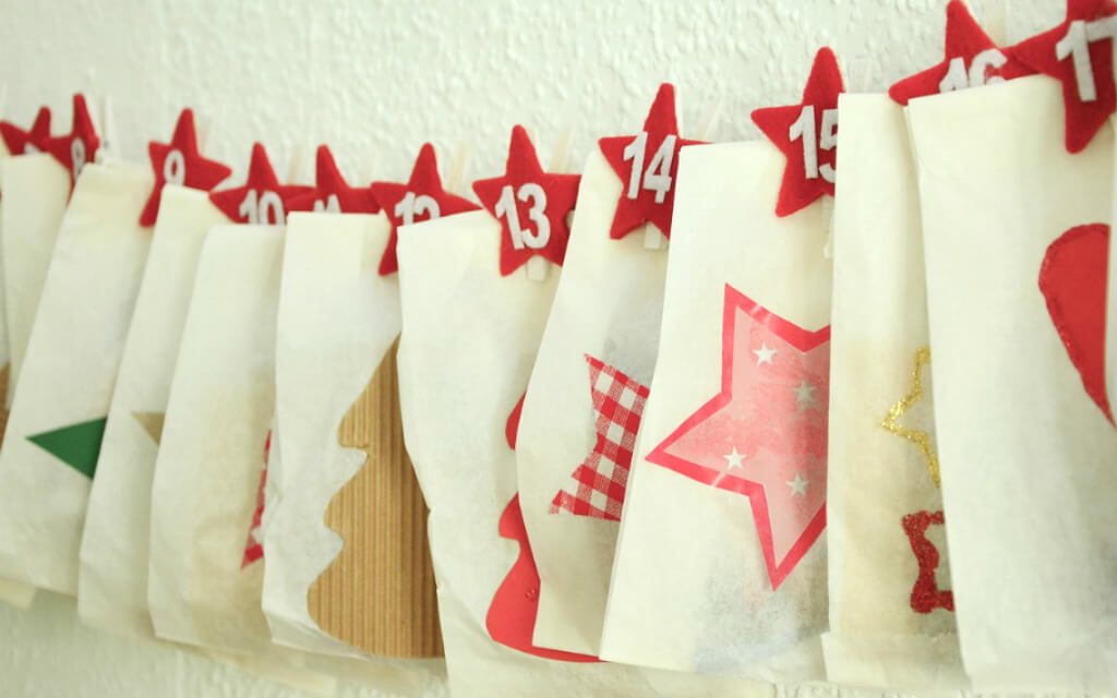 Inspirationen zum selber Basteln findet man u.a. auf dem Adventskalender-Portal. Dabei lassen sich alte Sachen zu netten Upcycling-Ideen wiederverwenden. Das Befüllen der persönlichen Kalender erfordert etwas Kreativität. Für die Eiligen ist ein Besuch in der Süßigkeitenabteilung bestimmt das Richtige, denn hier wird jeder schnell fündig. Einmal durch Veganz oder MaranVegan schlendern und schon sind 24 verschiedene Köstlichkeiten gefunden, wie z.B. Schoko-Riegel, Teebeutel, selbst abgefüllte Nüsse und Trockenobst, Pralinen, Super-Foods, oder Duftöle. Wer auch bei einem Adventskalender komplett auf (Plastik) Müll verzichten will, findet in der Mass Greißlerei viele Gewürze, Nüsse, Früchte, Tee oder auch Öl, das sich in kleinen Mengen abfüllen lässt. Soll auch etwas Nicht-Essbares in den Kalender eignen sich Zahnbürsten, Lippenpflege, Zopfgummi, Haarspangen, kleine Bücher z.B. von Pixie, Gutscheine für gemeinsame Abenteuer, Bahn-Tickets, Bastelsachen, Stifte und vieles mehr. Gutscheine und selbst geschriebene Lieblingsrezepte lassen sich einfach zusammenrollen und passen in jeden Adventskalender. Wie wäre es mit einem Kinoabend, einem Sonntags-Spaziergang oder einem selbst gemachten Essen? In den Koch- oder Backrezepten können, die zuvor im Kalender gefunden Ausstechformen, Zuckerstreusel, Gewürze o.ä. gleich verwendet werden. Eine schnelle spontane Alternative als kleine Advents-Aufmerksamkeit ist der Adventskalender aus Esspapier in Zahlenform. Wer den Adventskalender nicht selbst basteln, jedoch befühlen will, findet einiges im Internet z.B. bei jako-o oder buttinette. Für klassische Schoko-Adventskalenderliebhaber gibt es hier die veganen Optionen.