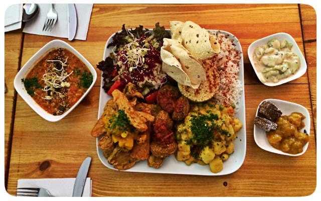 Während wir hungrig auf das bestellte Essen warten, geht die Bedienung, die gleichzeitig als Koch/Köchin fungiert, voller Eifer ans Werk. Die warmen Gerichte werden hier also alle frisch zubereitet. Daumen hoch! Noch bevor wir uns so richtig über den gemütlichen Einrichtungsstil unterhalten können steht auch schon unser Thali-Mixteller auf dem Tisch. Erster Gedanke? Wer soll das nur alles aufessen? Wir zückten Messer und Gabel und probierten uns – gefühlt – quer durch die indische Küche: Wir bekamen ein cremiges Linsen-Dhal mit Tomatenstückchen und frischen (!) Sprossen, das wir teils löffelten, teils als Dip für die fein gehobelten, gebackenen Gemüsesorten (Zucchini, Karotte, Kartoffel) verwendeten; knuspriges Papadam (dünne Flade aus Linsenmehl) fungierte als ideale Basis für 4 verschiedene, teils fruchtige, teils scharfe Chutneys; erfrischende Gurken-Raita und eine knackige Salatvariation lieferten einen milden Ausgleich für die feurigen Falafel; mit Safran und Paprika gewürzte Hirse und Reis ergänzten das Gemüsecurry der Saison. Als Dessert gab's vedisches Konfekt (sehr süß und von der Konsistenz an Trockenfrucht-Bällchen erinnernd) und einen Klecks „Apfelmus mit Zimt“ (wir nennen das jetzt einfach mal so). Obwohl wir nicht alles leergeputzt haben, wären wir nach diesem üppigen Mahl am liebsten in einer tiefen Hängematte versunken: Randvoll ist bestimmt noch untertrieben. Aber wer kann schon aufhören, wenn es so lecker schmeckt? Unsere anfängliche Idee, sich noch einen frischen Smoothie oder Kaffee mit Mandelmilch zu bestellen und dazu ein Stück glutenfreien Kuchen zu teilen, hatte sich damit leider erledigt. ;-)