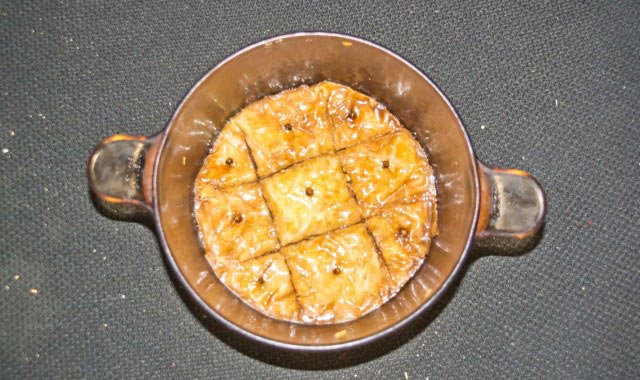 - Nach dem Backen den Sirup noch heiß über das ofenfrische Baklava gießen und einige Stunden einziehen lassen.