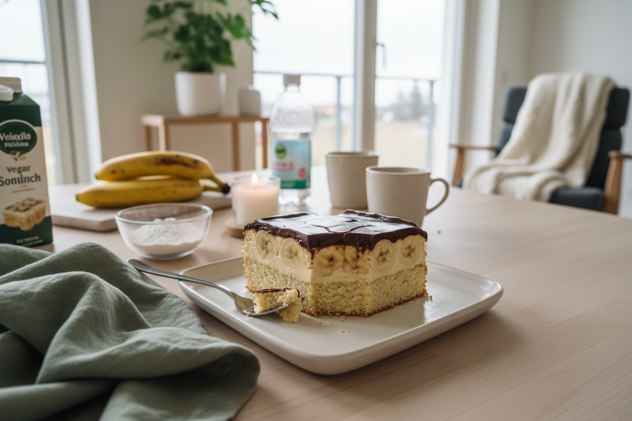 Bananenschnitten sind ein echter Klassiker der österreichischen Backstube - und diese vegane Version steht dem Original in nichts nach! Mit luftigem Biskuitboden, cremigem Vanillepudding, frischen Bananenscheiben und einer glänzenden Schokoglasur ist dieses Rezept ein absoluter Publikumsliebling.