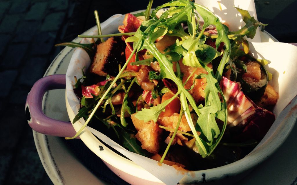 - Tomaten würfeln und mit dem Brot und allen weiteren Zutaten in eine Schüssel geben. Mit Essig, Öl abmachen, abschmecken und für min. 5min ziehen lassen.