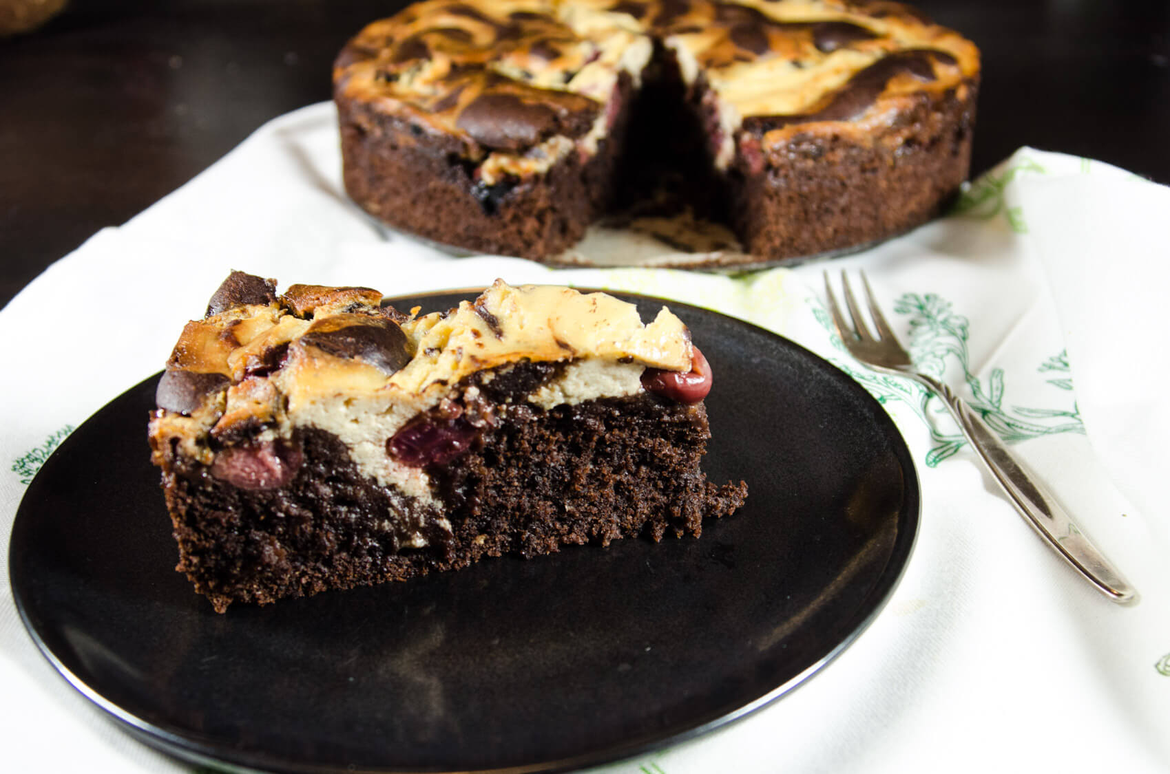 - % des Teiges in eine gefettete Springform (24cm Durchmesser) geben und glatt streichen. Den Schoko-Teig mit Sauerkirschen belegen.