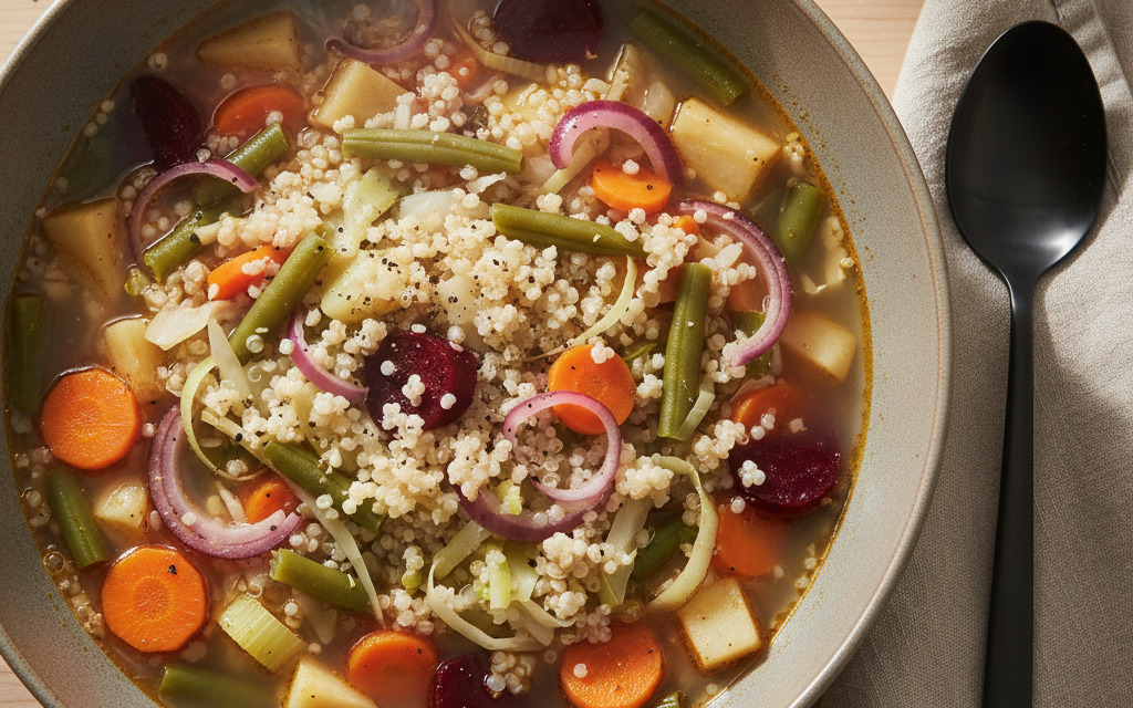 Bunte vegane Gemüsesuppe mit Quinoa für kalte Tage