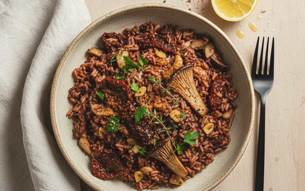 Veganer roter Camargue-Reis mit Pilzen und getrockneten Tomaten