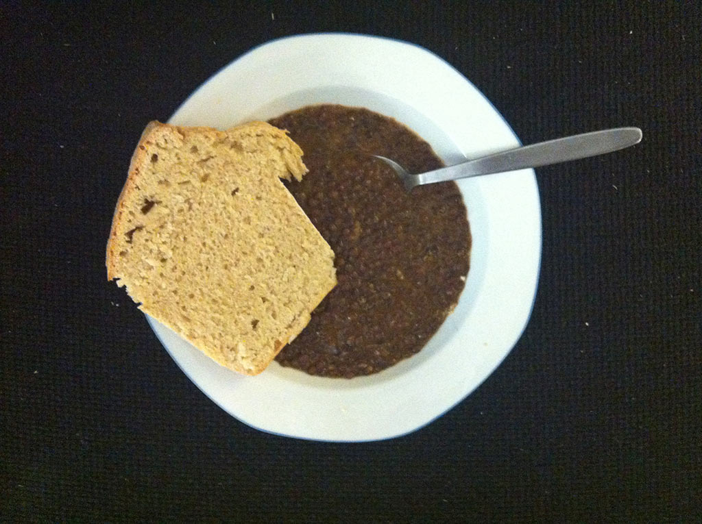 - Die Belugalinsen über Nacht (mindestens 8 Stunden lang) in reichlich kaltem Wasser einweichen, danach abseihen und in 2 Liter Wasser mit einem Teelöffel Salz kochen bis sie weich sind. Im normalen Kochtopf dauert das etwa 45 Minuten – besonders gut wird die Konsistenz jedoch durch Kochen im Druckkochtopf. Nach dem Kochen die Linsen abseihen und etwa einen halben Liter des Kochwassers auffangen.