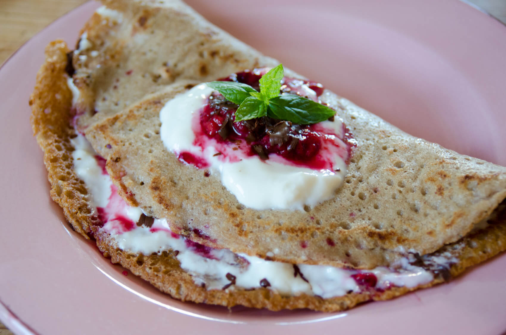 - Warm mit Fülle nach Belieben genießen. Wir haben Sojajoghurt, Himbeersauce und Schoko hinein.