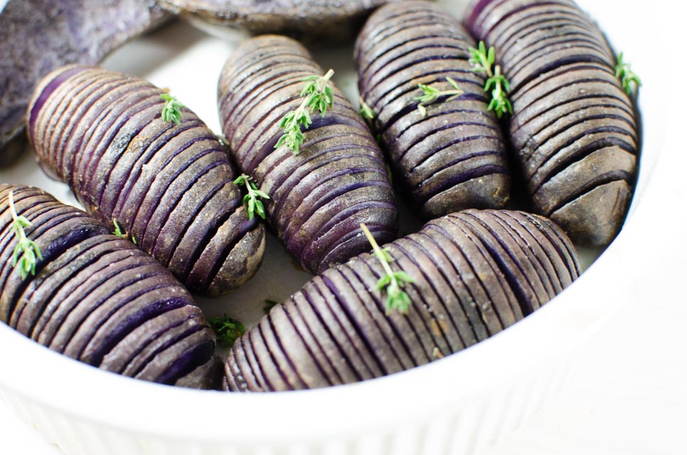 Violette Vegane Fächerkartoffeln mit Thymian