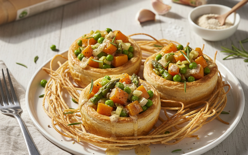 - Nun jeweils 2-3 EL Gemüse in das Teignest setzen und mit etwas Sahne auffüllen.