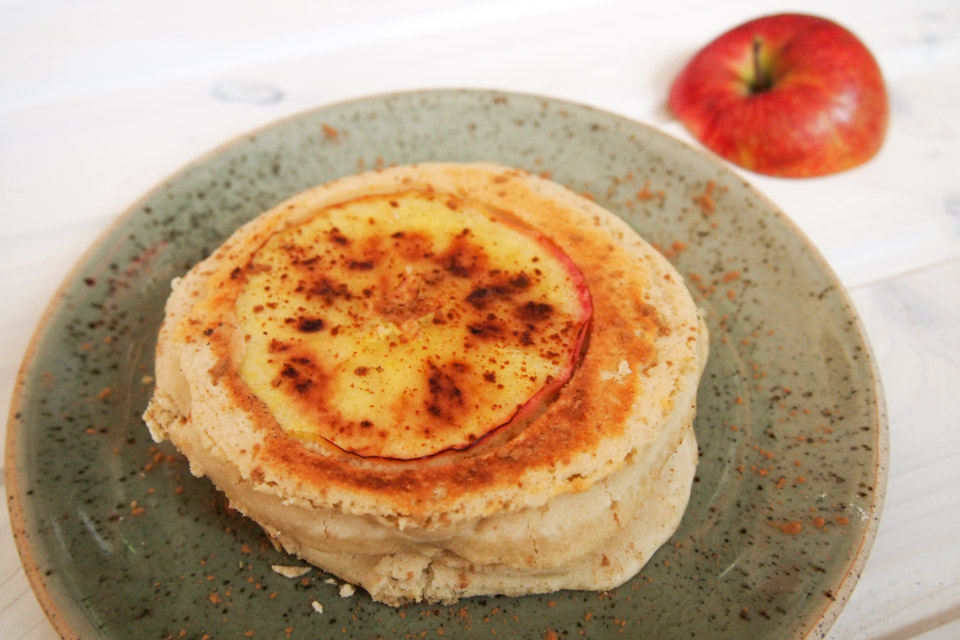 - Eine Pfanne mit Kokosöl heiß werden lassen, Einen Schöpfer Pfannkuchen-Teig hineingeben, verlaufen lassen und Apfelscheiben darauf legen und festdrücken. Von beiden Seiten goldbraun backen und mit Agavensirup und Zimt servieren.