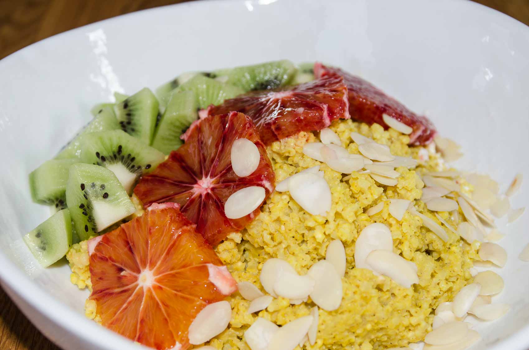 Goldene Vegane Hirse-Frühstücksbowl mit Früchten