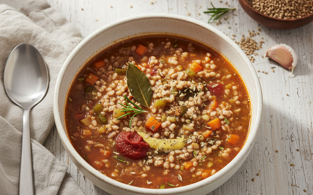 - Die Gemüsebrühe mit dem Suppengemüse, dem Lorbeerblatt und Rosmarin sowie weiteren Gewürzen, Knoblauch, Tomatenmark und Senf aufkochen lassen und das Grünkernschrot einrühren. Für 10-15min köcheln lassen bis das Schrot weich ist.