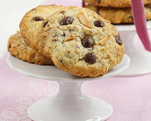 - Mehl, Zucker, Haferflocken, Backpulver und Vanille mischen. Mit Butter, Pflanzensahne und Bittermandelöl zu einem gleichmäßigen Teig kneten. Anschließend Schokoladentropfen und Mandeln vorsichtig einarbeiten.