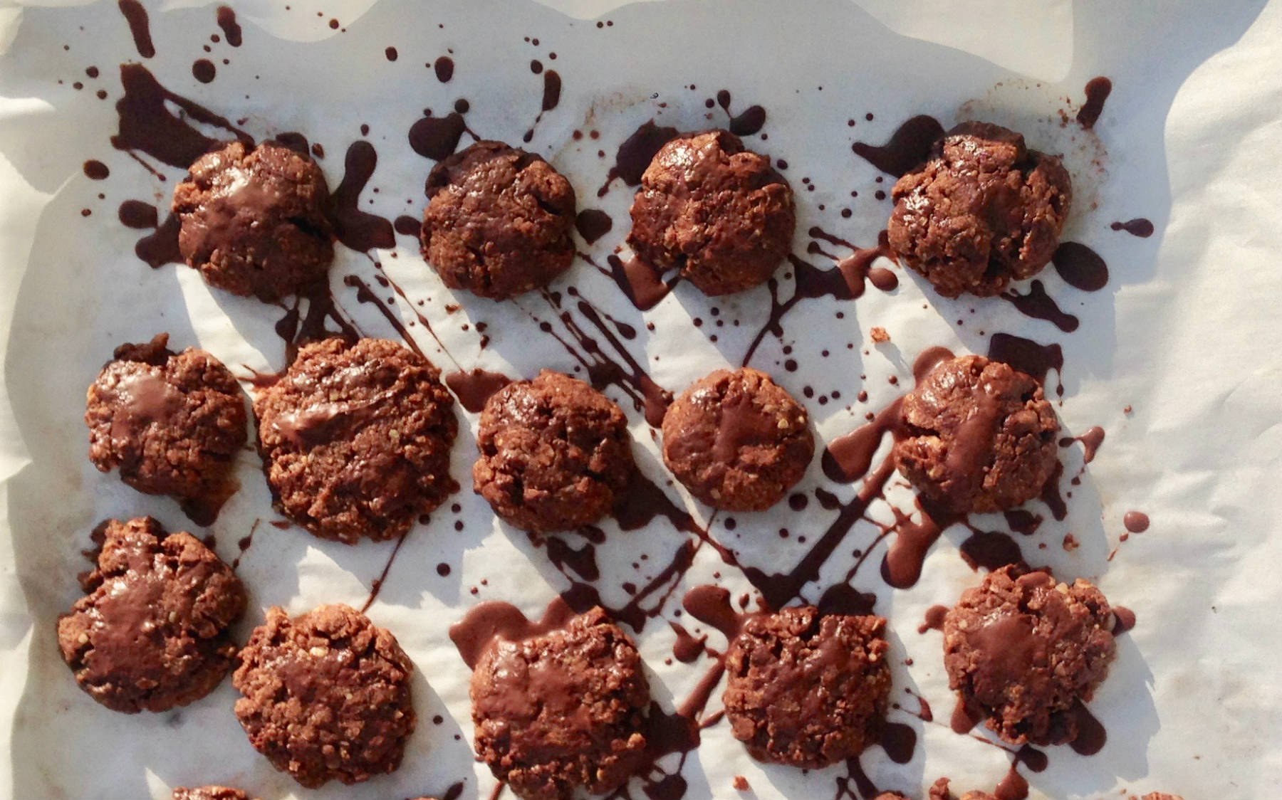 - In der Zwischenzeit bereite die Glasur vor. Lasse dazu Kokosöl schmelzen und vermische es mit Kakaopulver und Agavendicksaft. Gut verrühren und die Cookies damit glasieren wenn sie ausgekühlt sind.
