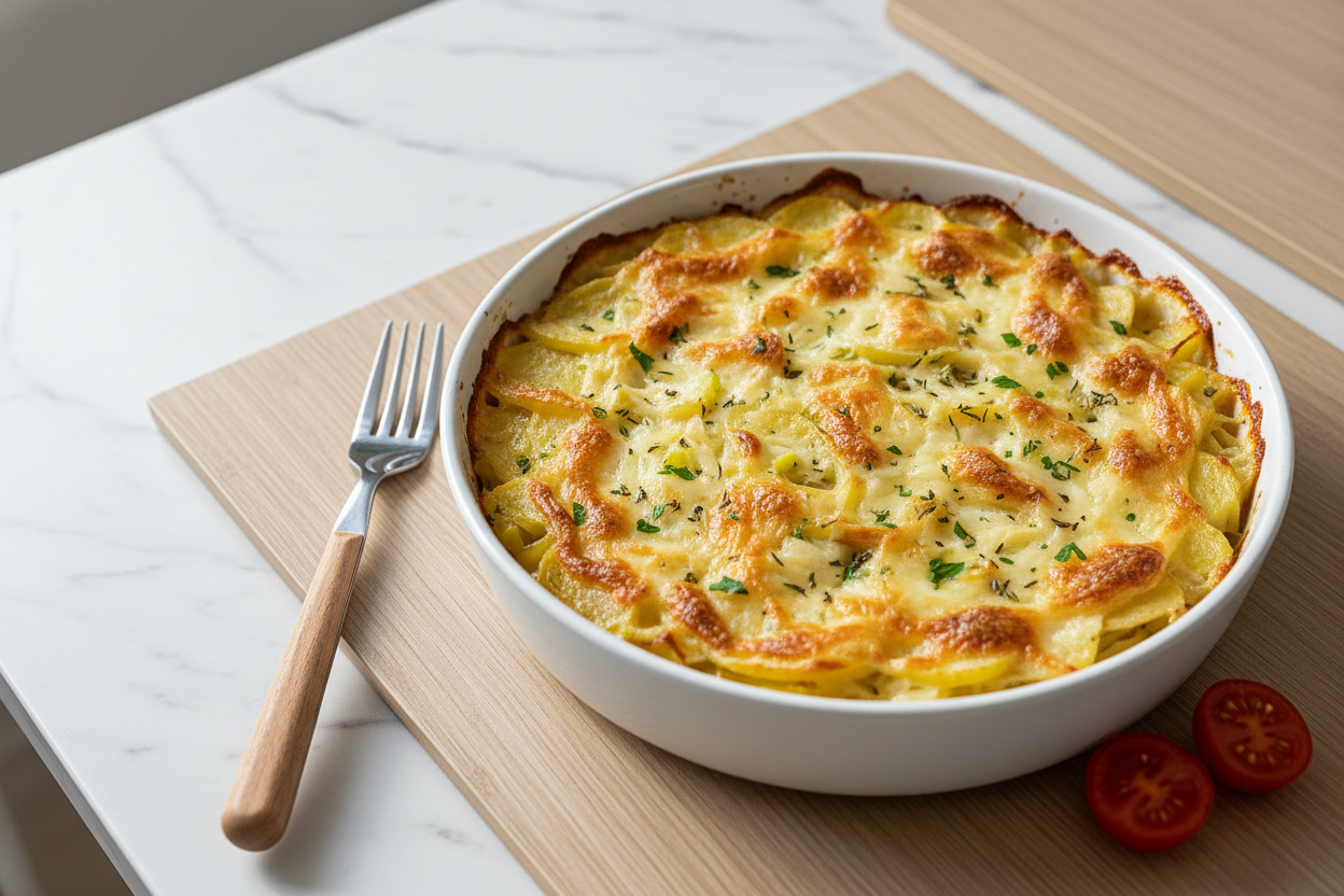 - Bei 180°C bei Ober-/Unterhitze für ca. 40min backen. Am besten für die ersten 20min mit Alufolie abdecken. Wenn die Kartoffeln weich sind, den Käse darüberstreuen und backen bis der Käse geschmolzen ist.