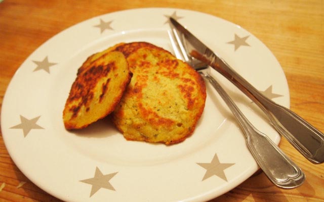 - Mit Salz, Sojamehl und Kartoffelstärke vermischen und in einer heißen Pfanne goldbraune Puffer braten.