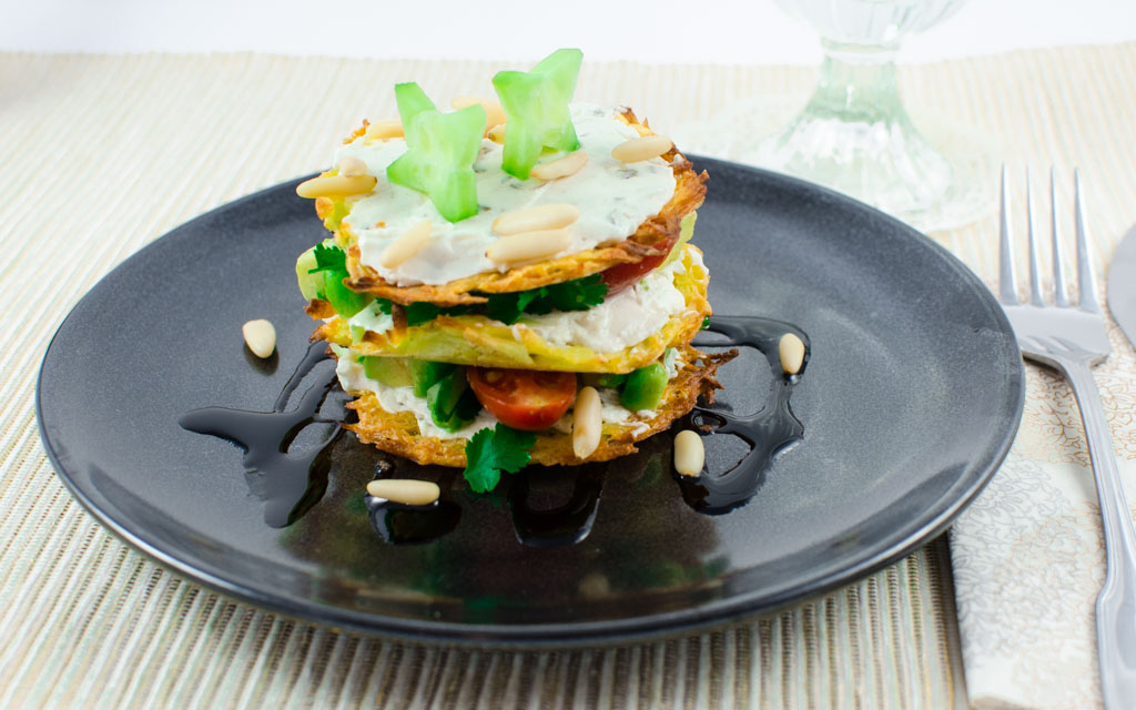 Knusprige vegane Kartoffel-Taler mit Frischcreme und Avocado