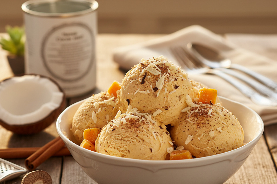 Veganes Kürbis-Kokos-Eis mit weißer Schokolade