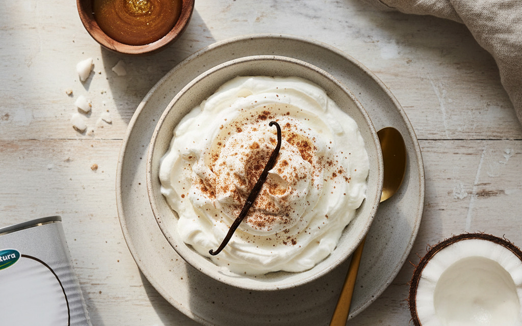 - Die Dose Kokosmilch über Nacht in den Kühlschrank stellen, öffnen und den wässrigen Teil abschütten. Den kann man z.B. für den nächsten Smoothie oder zum Kochen verwenden.