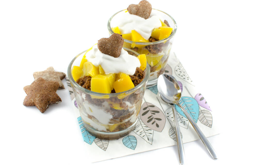 - Dessertgläser jeweils mit einer Schicht zerbröselter Lebkuchen, gefolgt von Pfirsichen und je einem EL Pfirsichsaft, der darübergeträuftelt wird und einem gehäuften EL Kokossahne füllen. Solange wiederholen bis alles aufgebraucht ist bis auf 4 Kekse für die Garnitur.