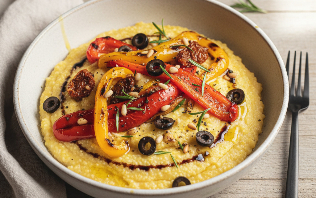 Mediterrane vegane Polenta mit gegrilltem Paprika