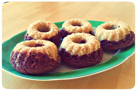 - Nun die Förmchen bzw. Form mit der hellen Teigmasse bis zur Hälfte befüllen, danach die Kakaomasse darübergießen.