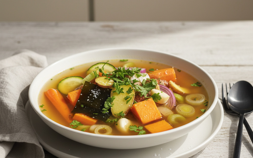 - Zur fertigen Gemüsebrühe noch Salz hinzufügen.
