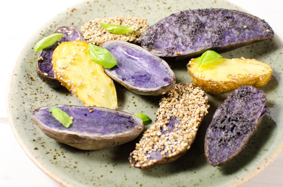 - 3/4 kg Kartoffeln, am besten festkochende, biologische violette und gelbe Kartoffeln gemischt