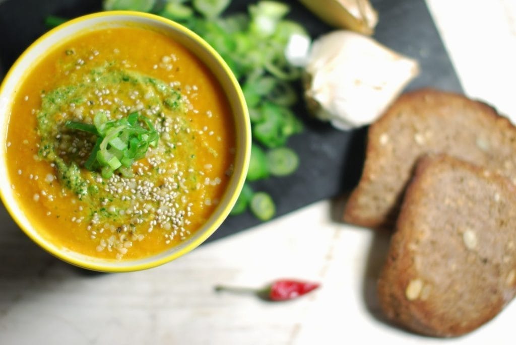- Die Suppe mit dem Pürierstab zu einer cremigen Masse pürieren und mit pflanzlicher Sahne und Orangensaft verfeinern. Nun noch nach deinem Geschmack mit den Gewürzen abschmecken.