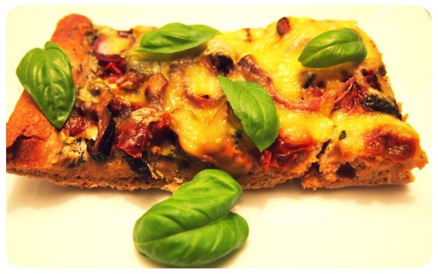 - Mit Pilzen, getrockneten Tomaten, Zwiebel und weiteren Zutaten nach Belieben belegen und bei 200°C 20-25min backen.