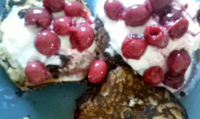 - Wir haben die Pancakes mit Soja-Joghurt und Sauerkirschen getopt und können die Kombination nur weiterempfehlen.