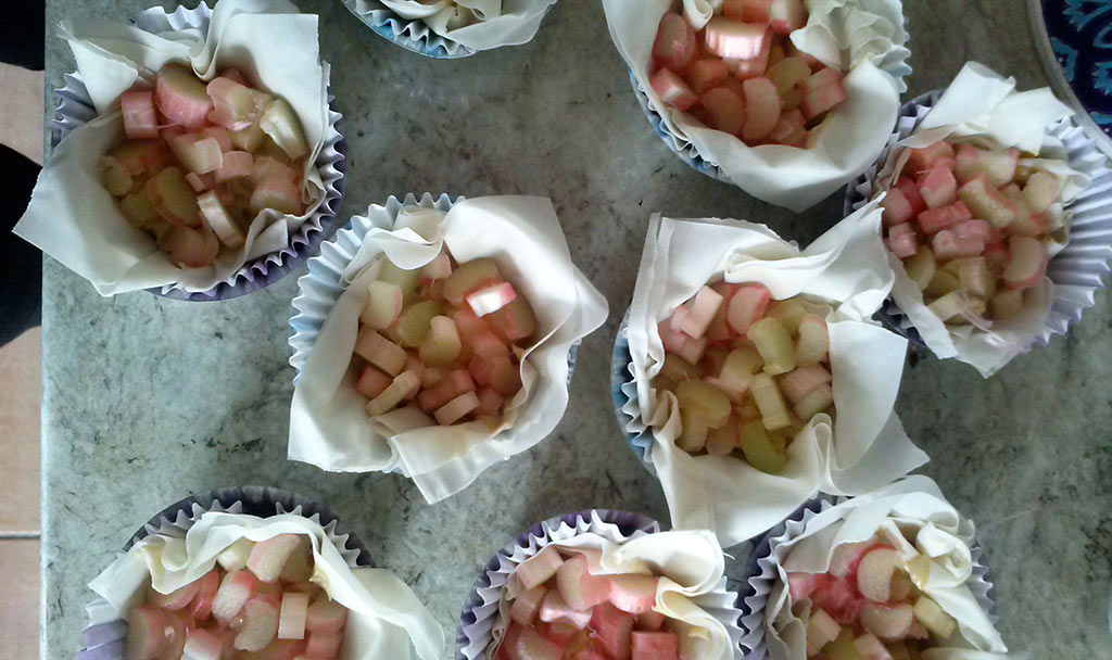 - Rhababer in dünne Stücke scheiden und die Muffins damit belegen.