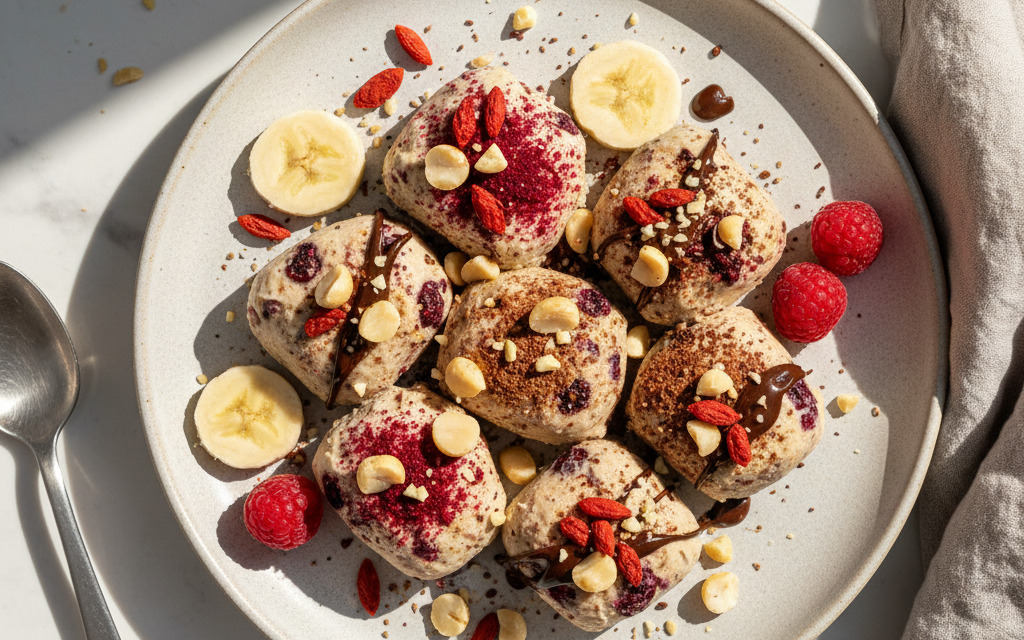 - Mit Gojibeeren und Nüssen bestreuen und ab in das Tiefkühlfach.
