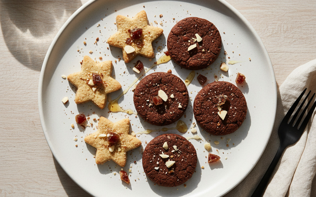 - Kleine Teigportionen zwischen zwei Lagen Backpapier ausrollen und Kekse ausstechen. Auf einem Teller offen liegen und trocknen lassen. Danach, falls etwas übrig ist, im Kühlschrank aufbewahren.