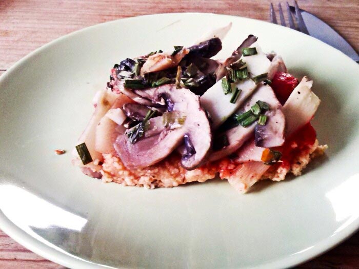 - Die Champignons und die Frühlingszwiebel waschen, schneiden und in einer Pfanne mit wenig Öl (oder etwas Wasser) kurz braten. Gut würzen und gepressten Knoblauch und Kräuter falls getrocknet hinzufügen.