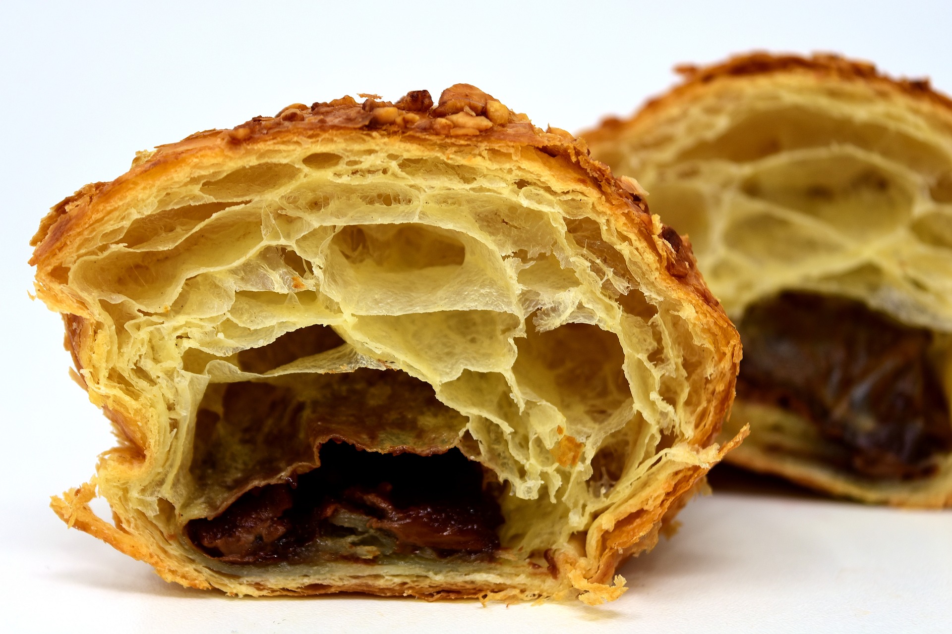 - Jedes Dreieck gleichmäßig mit dem Schoko- bzw. Nussaufstrich bestreichen und dann einrollen, damit ein Kipferl/Croissant entsteht, also von der langen Seite hin zum Spitz des Dreiecks.
