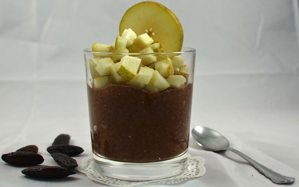 Veganer Schoko-Chiapudding mit Tonkabohne & Birne
