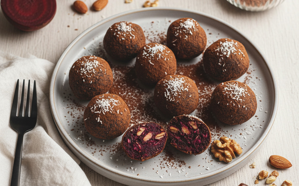 So klein und schon im Mund. Diese Schoko-Kugeln sind ganz ohne Zucker, glutenfrei und auch noch gesund. Das gewisse Extra kommt durch die Rote Bete. Zuerst probieren lassen und dann das Geheimnis lüften und sich über die erstaunten Gesichter freuen.