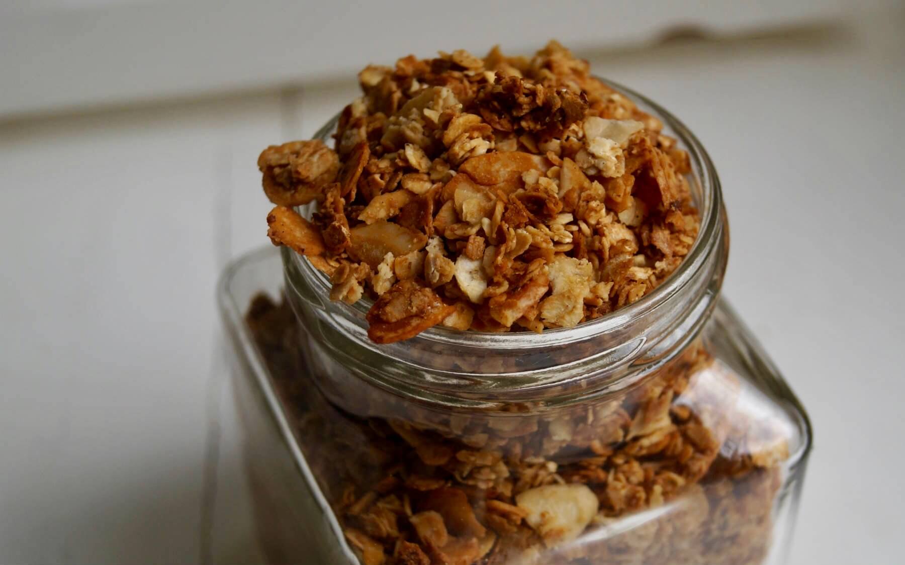 - Wenn das Granola schon eine schöne Farbe bekommen hat, aus dem Ofen nehmen und auskühlen lassen. Wenn es dann vollständig ausgekühlt ist, luftdicht verschließen und bei Raumtemperatur für ca. 3 Wochen haltbar.