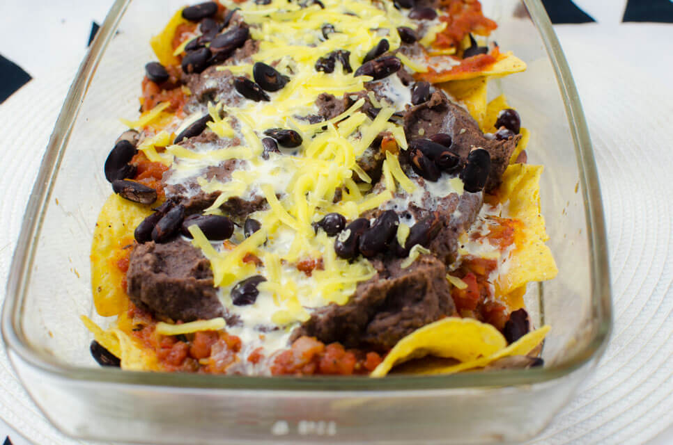 - Die Tortilla Chips in eine Ofenform geben. Die Salsa und das Bohnenmus darauf verteilen. Saure Sahne darauf geben und mit Käse besträuen.