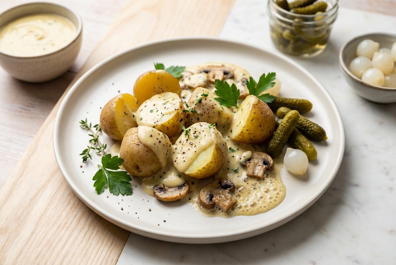 - Den Inhalt der Pfännchen über die warmen Pellkartoffeln geben. Mit Gewürzgurken, Silberzwiebeln und frisch gemahlenem Pfeffer servieren.