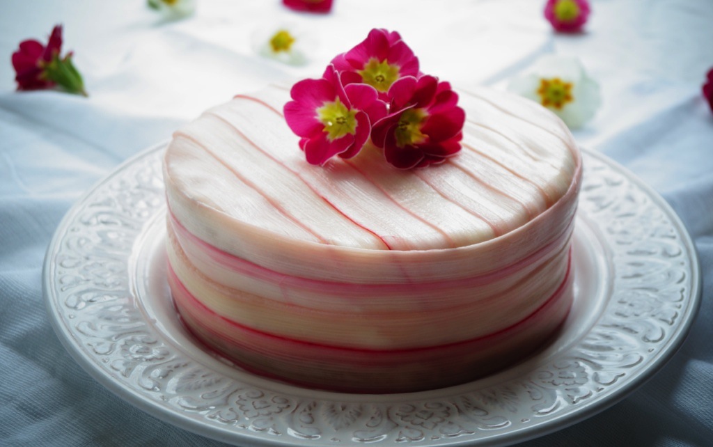 - Die abgekühlten Streifen mit Küchenpapier leicht trocken tupfen. Nun die Torte aus dem Kühlschrank nehmen und dekorieren. Zuerst für den Deckel einige Rhabarberstreifen kürzen, so dass sie wie auf dem Bild leicht über den Deckel hinausgehen. Wenn oben die Streifen aufgelegt wurden, einen langen Streifen um den oberen Rand der Torte legen. Von oben nach unten weiterfahren, bis die ganze Torte ummantelt ist. Falls die Rhabarberstreifen nicht zusammenhalten, mit dem Champagnersud leicht einpinseln.