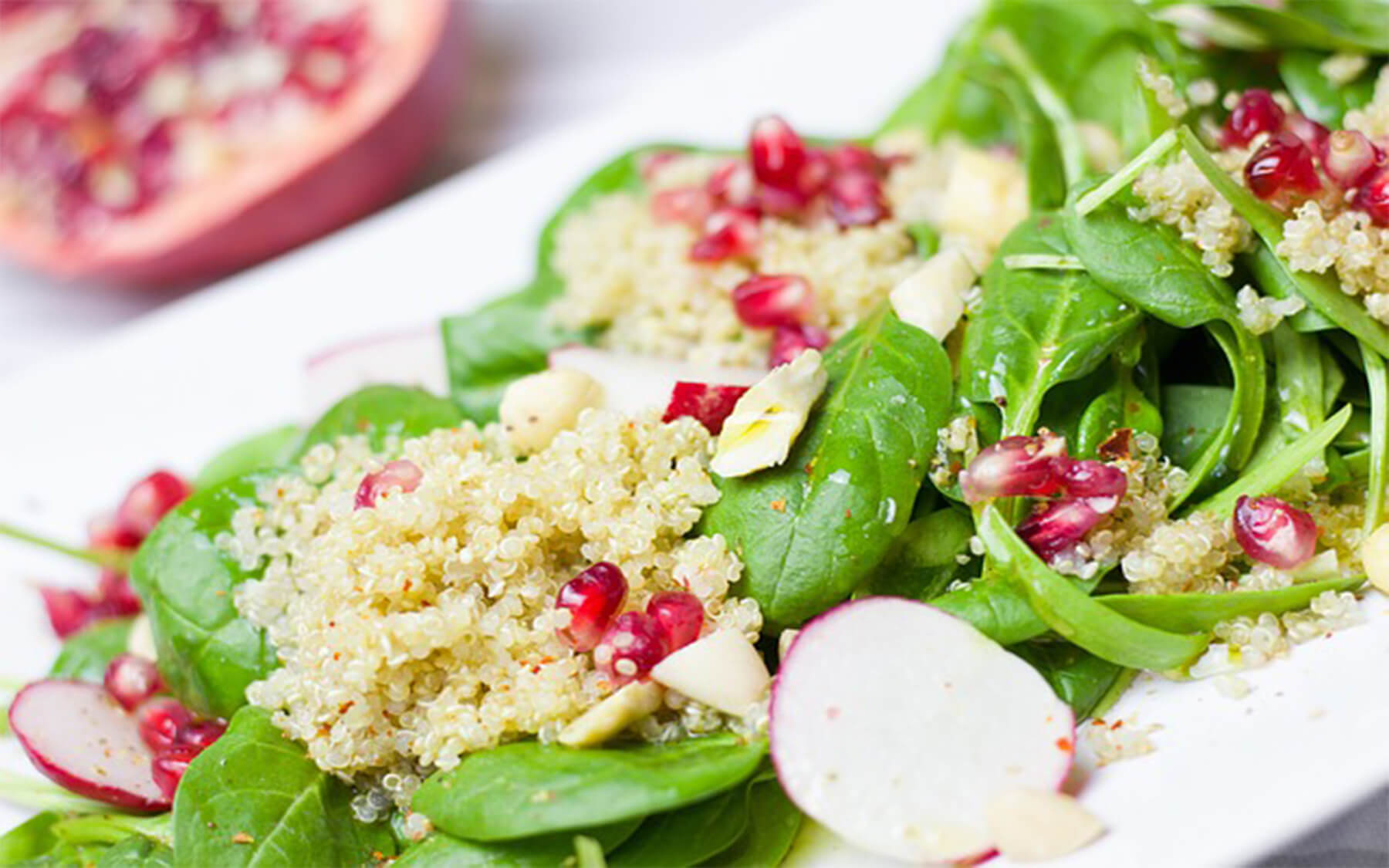 - Granatapfelkerne, Avocadowürfel, Mandeln, Radieschen, Spinat und Koriander und Petersilie zum Couscous dazugeben. Würzen, mit Öl marinieren und sich schmecken lassen.