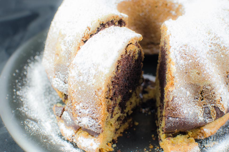 - Die andere Hälfte des Teigs mit den Zutaten für den dunklen Teig noch mal mixen und auch in die Form geben. Mit einer Gabel durch den Teig fahren, um das typische Marmormuster zu zeichnen.