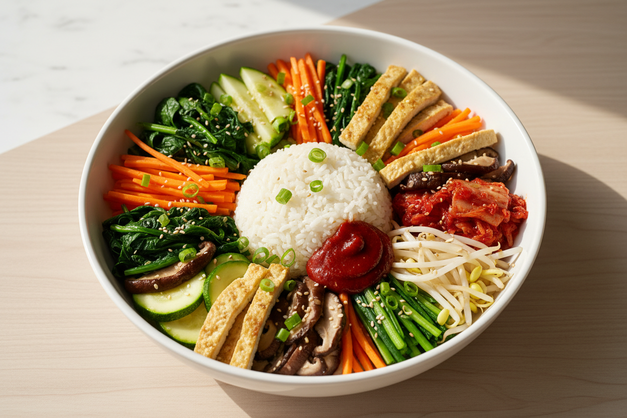 Bibimbap bedeutet wörtlich "gemischter Reis" - und genau darum geht es! Warmer Reis, buntes Gemüse, würziger Tofu und die unverzichtbare Gochujang-Sauce werden erst am Tisch vermischt. Das Ergebnis ist eine Geschmacksexplosion in jeder Gabel.