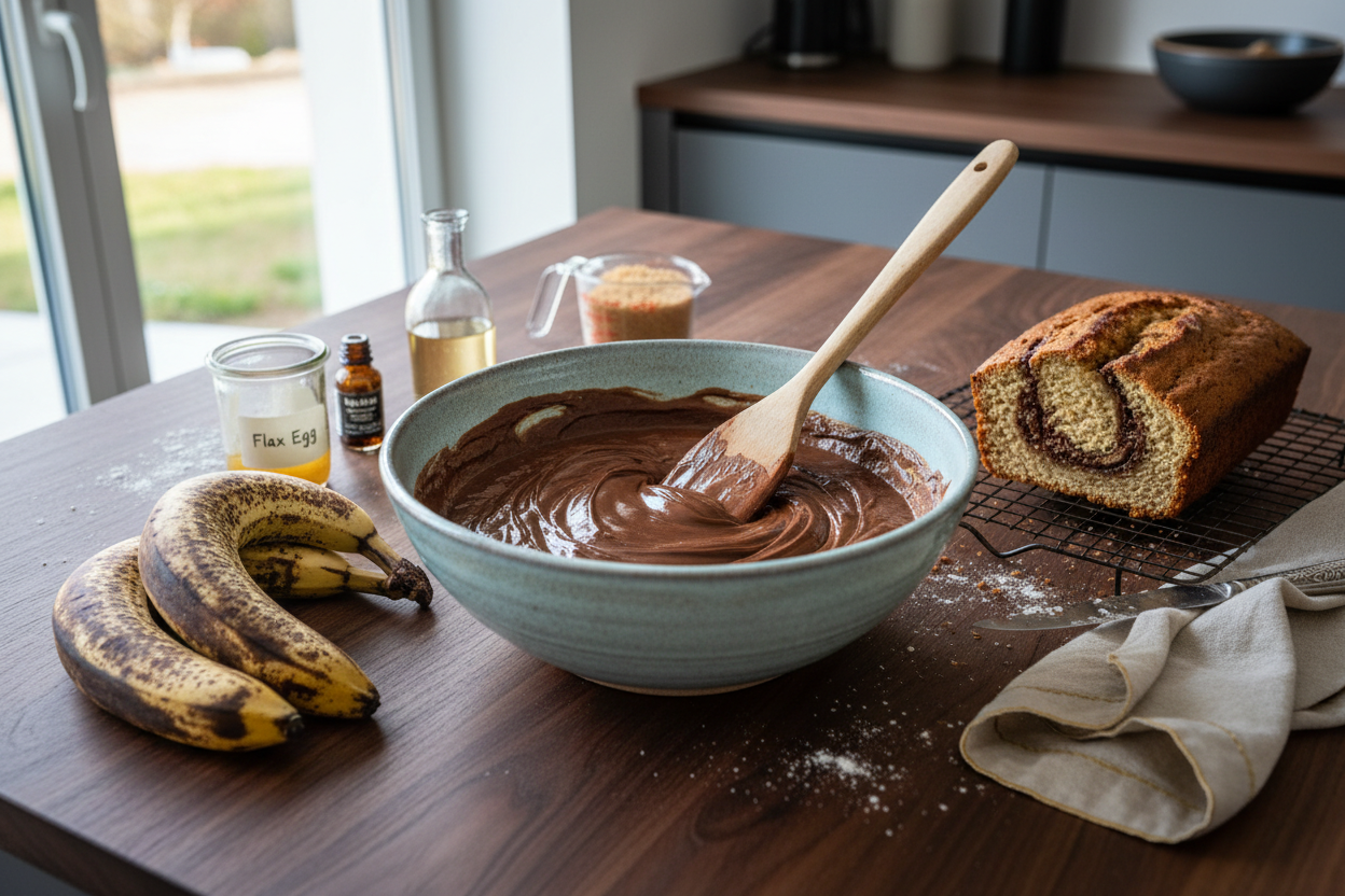 Nutella Plant Based kurz in der Mikrowelle anwaermen (10-15 Sekunden) bis es fluessig genug ist zum Traeufeln. Die Haelfte des Teigs einfuellen, Haelfte der Nutella traeufeln, restlichen Teig darueber, restliche Nutella traeufeln. Mit einem Zahnstocher oder Messer in langen S-Bewegungen oder Spiralen durch den Teig ziehen. Weniger ist mehr - zu viel Ruehren vermischt alles und der Swirl verschwindet.