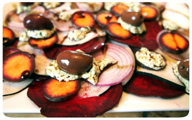- Das Dressing glatt rühren und Klecks-weise auf das Gemüse geben. Auf jeden Klecks eine Olive setzen und ev. noch etwas Kürbiskernöl darübertröpfeln.